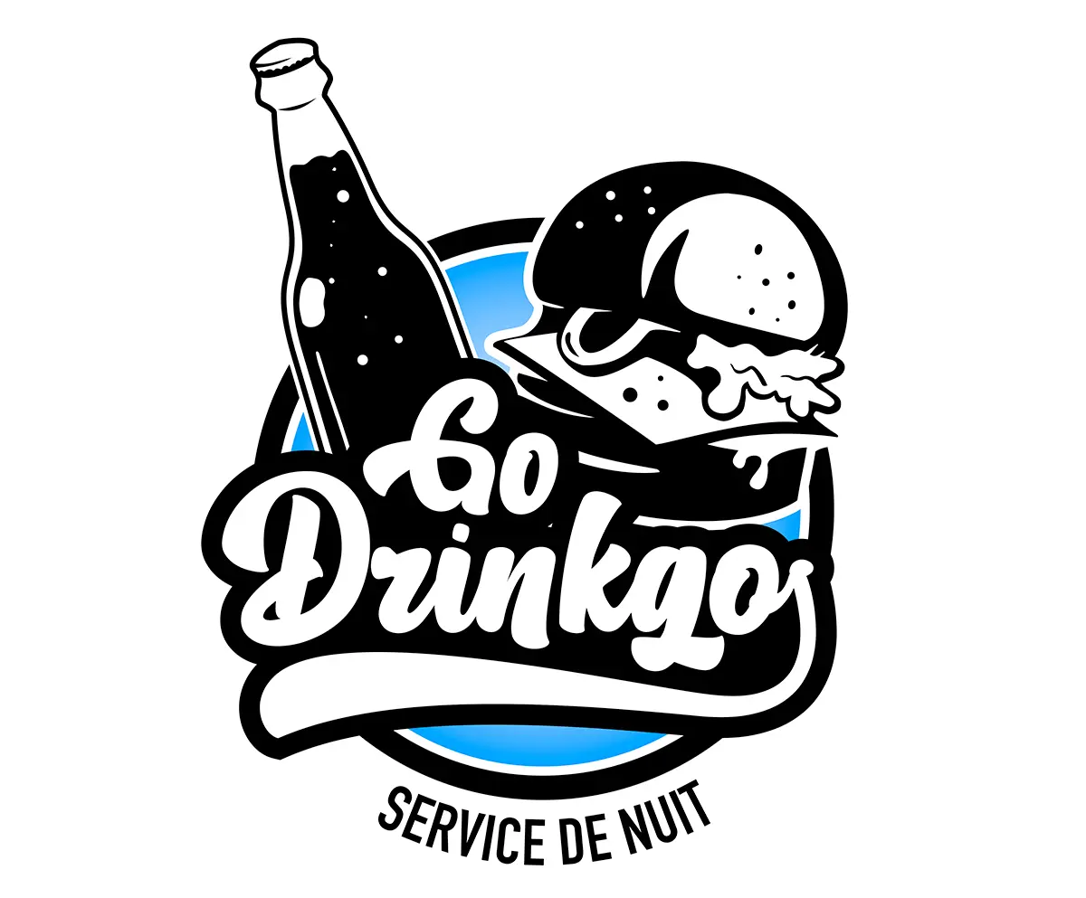 Godrinkgo est un service axé sur la livraison de nuit dont le logo rappelle les couleurs de la nuit (fond en bleu dégradé). La boule bleue circulaire du fond peut évoquer la forme de la lune ou d’une horloge, toujours la dimension de la nuit. Ce logo très illustratif d’aspect vintage — tant dans les pictogrammes que dans la police d’écriture —, rappelle l’authenticité (la qualité à l’ancienne) et les codes de la restauration rapide propre aux « diners » américains.